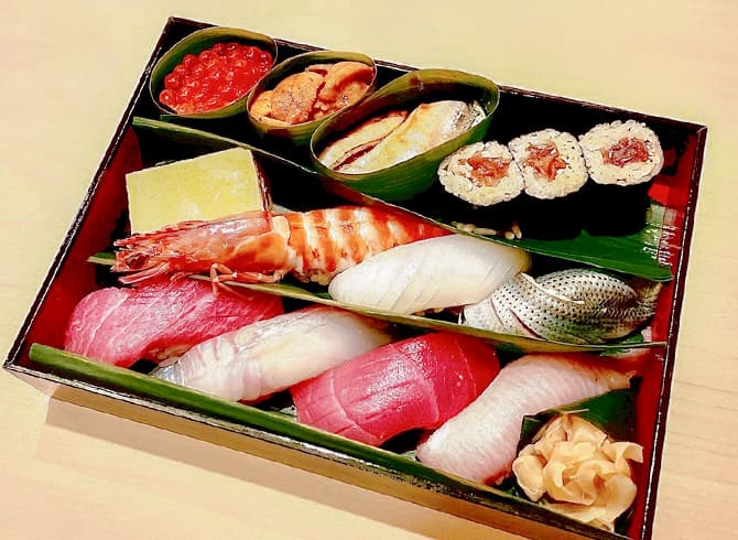 MORE江戸前伝統の赤酢で仕上げたシャリと、こだわりの旬のネタで握る鮨をお持ち帰りにてご用意いたします。掲載写真は「百合(特上握り10貫/玉子/巻物)」です。