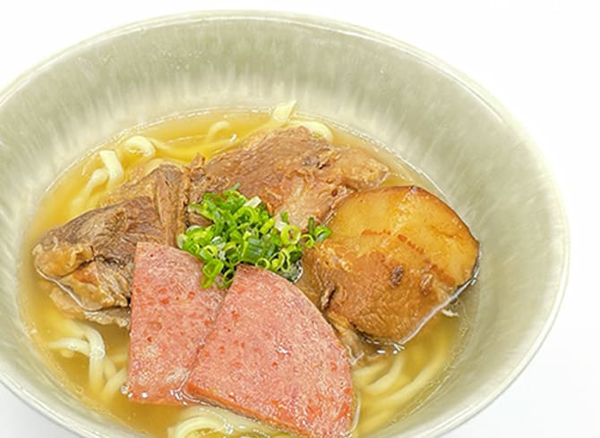 MORE特製やんばるそばは、出汁の旨みが際立つスープに、ポークランチョンミート・軟骨ソーキ・ラフティを一度に味わえる、贅沢な一杯です。